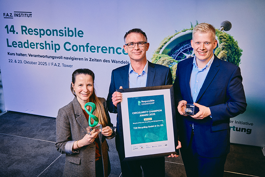 Jenny Sbosny, Leiterin Kommunikation & Marketing, Michael Jasperneite, Geschäftsführer TSR Deutschland (Mitte), und Jost Giesing, Referent ESG (Environment, Social, Governance), nahmen für TSR den Circularity Champion Award 2025 in Frankfurt entgegen