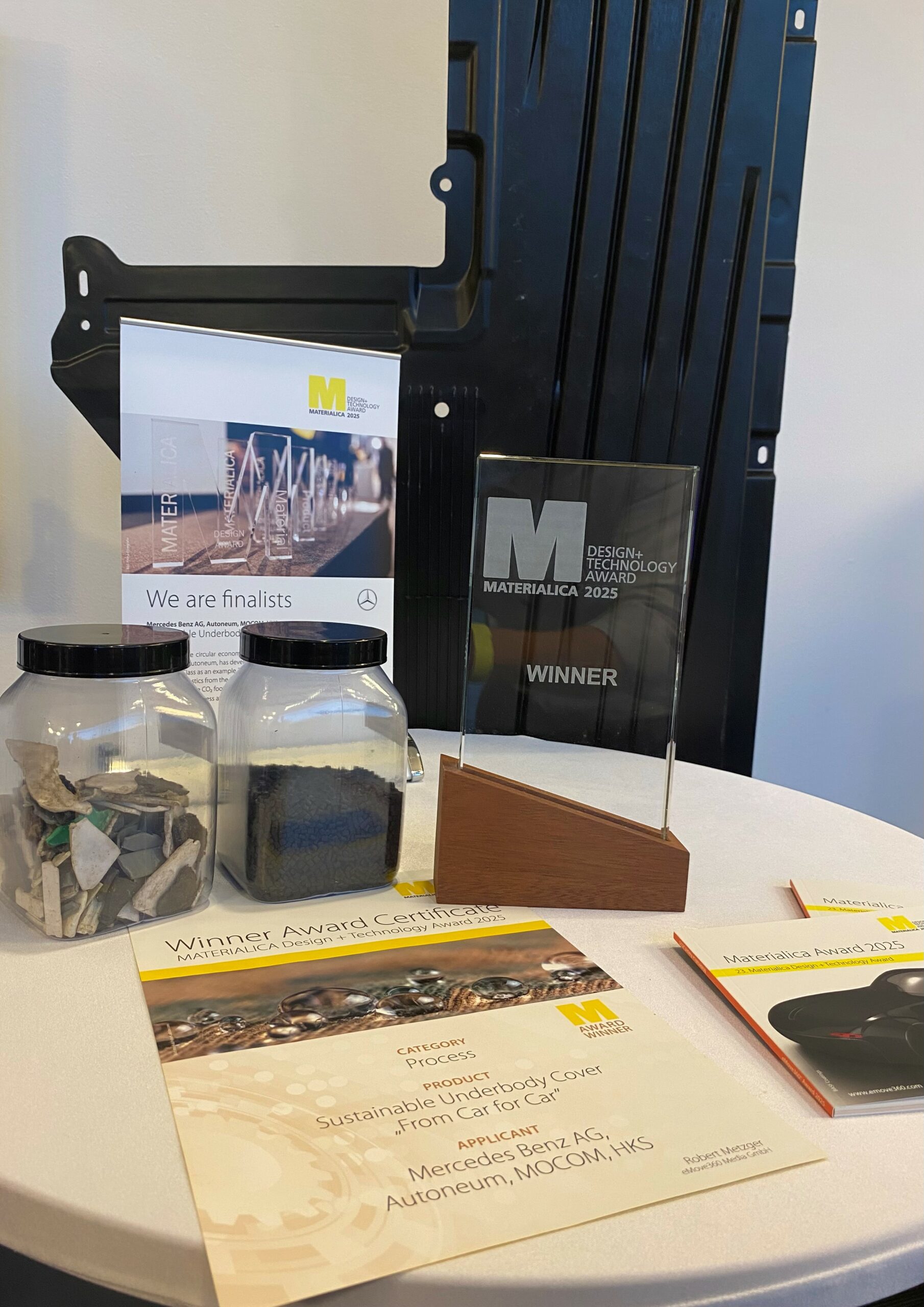 Der Materialica Design + Technology Award zählt zu den führenden europäischen Auszeichnungen für nachhaltige Material- und Produktinnovationen. Er würdigt Lösungen, die ökologische Verantwortung und technische Leistungsfähigkeit miteinander verbinden. HKS hat gemeinsam mit dem Automobilhersteller Mercedes-Benz sowie den Zulieferern MOCOM und Autoneum eine Unterbodenverkleidung aus recyceltem Kunststoff entwickelt.